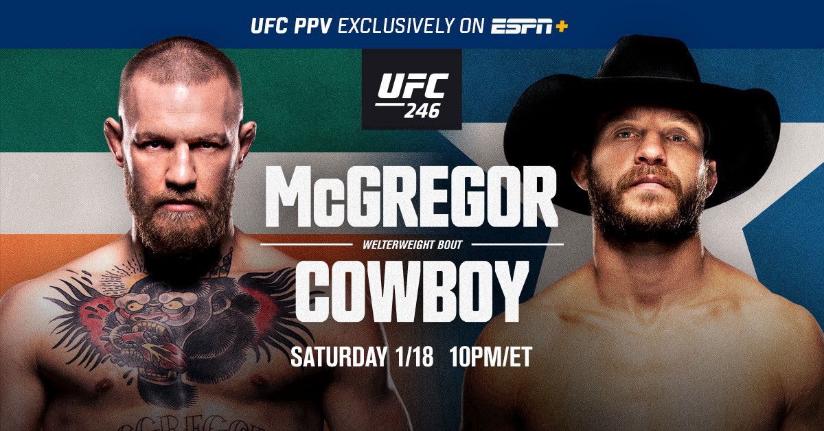 Na turnaji UFC 246 sa v očakávanom hlavnom zápase večera po dlhej pauze predstavil Conor McGregor proti Donaldovi Cerronovi prezývanému "Cowboy". Ír na nič nečakal a hneď od prvej sekundy na súpera vybehol. Už za 40 sekúnd bolo vymaľované keď po tvrdých úderoch rozhodca ukončil zápas a Conor si tak pripísal víťazstvo technickým k.o. (TKO).